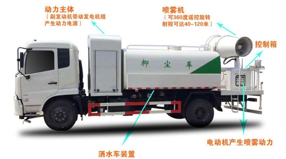 5.配套柴油发电机组供电安装在运输车辆上,操作灵活,使用安全可靠,遥控和人工控制操作,可随意控制调节水平旋转喷雾角度。