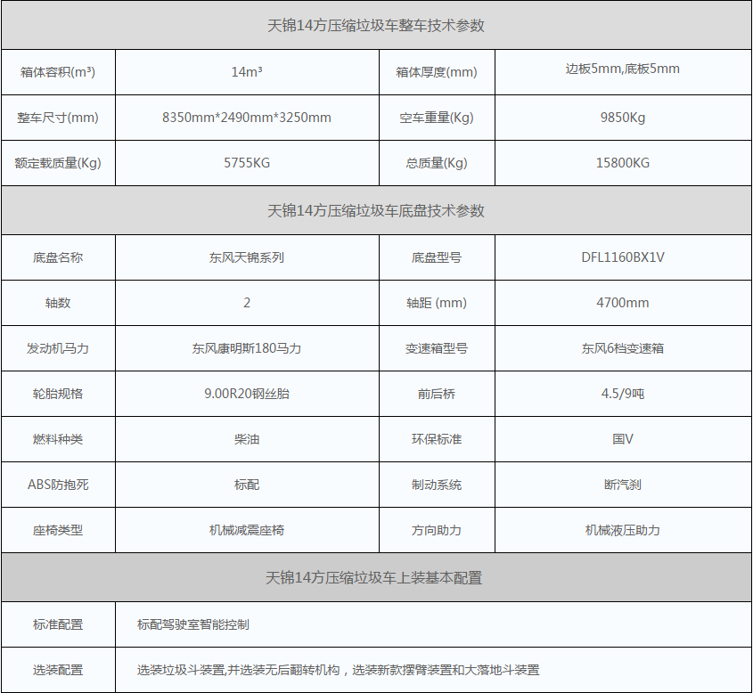 天锦14方压缩式垃圾车,采用中日合资的东风天锦高端环卫车系列底盘,平头一排半豪华驾驶室,液压翻转设计,检修更方便。东风康明斯180马力高性能柴油发动机,正宗国V排放标准,中美合资技术,性能卓越,品质有保证,配东风自主研发的6档手动变速箱,传动效率高,驾驶体验好。原厂空调、方向助力、离合助力、ABS防抱死系统、减震座椅,断汽刹,配置分配合理,实用性强。