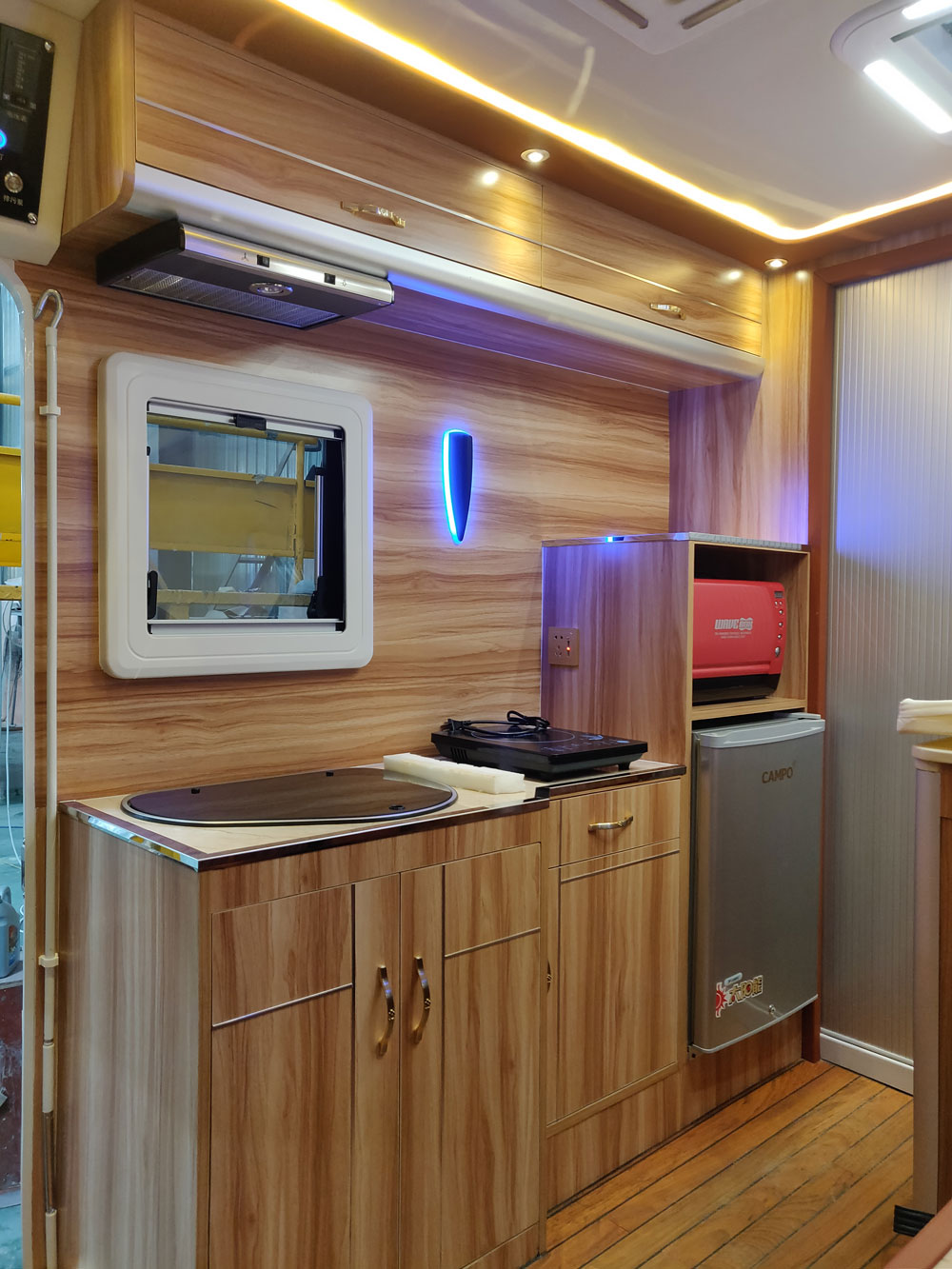 车辆的储物柜和厨房.电冰箱.微波炉(烤箱)和美的全套房车厨房系统.洗.做.切一体式.无烟低噪音抽烟机让你移动的家没有一点异味.固定的电磁炉,可以在让你清晨起来有碗养胃的粥.夏天户外的烧烤。冬天房车里的火锅.走到哪里都有美食相伴.
