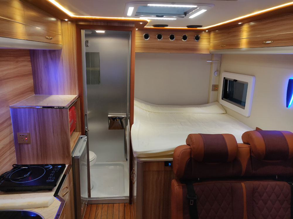 方便的出入会客区和驾驶位,高清显示屏可以接收电视信号和一些USB,蓝牙的音频播放功能.外出不管是追剧还是看电影看娱乐都不会落下.把显示屏放到以后上面是一个床位.娱乐休息两不误.显示屏下方可以放置茶壶.咖啡机.在旅居中开启休闲的生活.