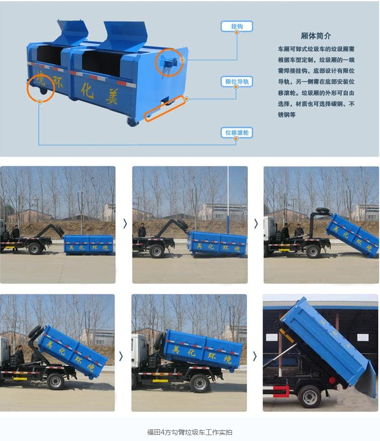 配套垃圾箱容积为4立方,副车架采用16号低合金槽钢、20号方管与8mm、5mm、4mm、16Mn钢板焊接而成,翻转架与活动勾臂垃圾车动作设计合理可靠,实现拉箱、锁紧、放箱和自卸操作简单方便,控制方式为驾驶室智能控制,也可根据用户需要选装驾驶室外传统操作杆进行控制,双液压油缸举升,性能更好,多路阀采用国内知名品牌供应商,阀体性能稳定,故障率低。