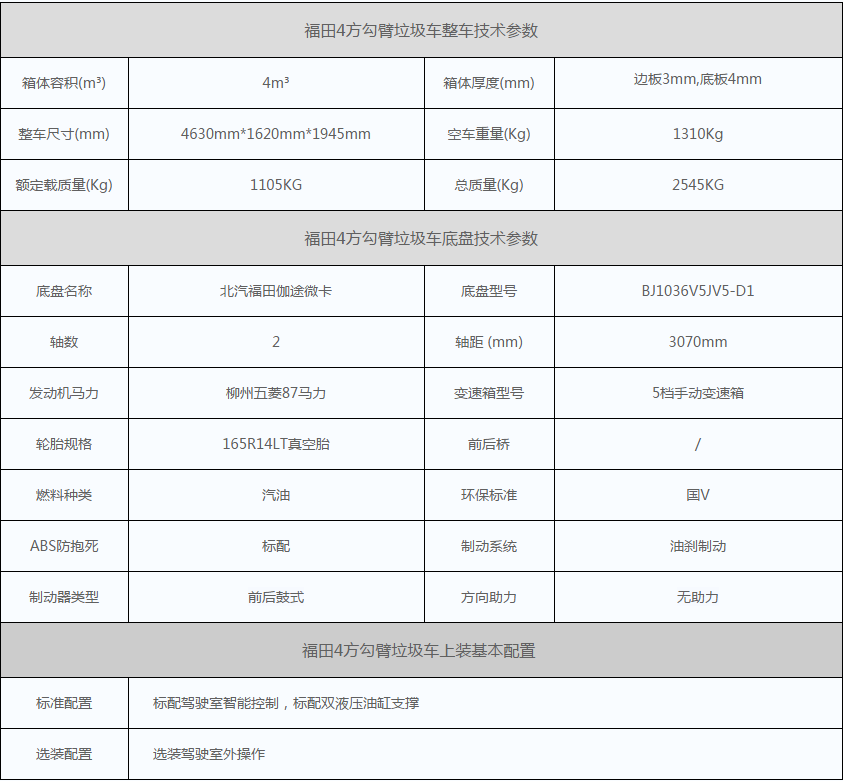 福田4方勾臂式垃圾车,采用北汽福田出品的高端伽途系列微卡底盘,伽途专用单排驾驶室,北汽经典钻石标LOGO,时尚大气,底盘轴距3070mm,动力总成采用柳州五菱87马力高性能汽油发动机,五菱品质,值得信赖!正宗国V排放标准,配5档手动变速箱,起步轻快,动力充沛,油耗表现优秀。