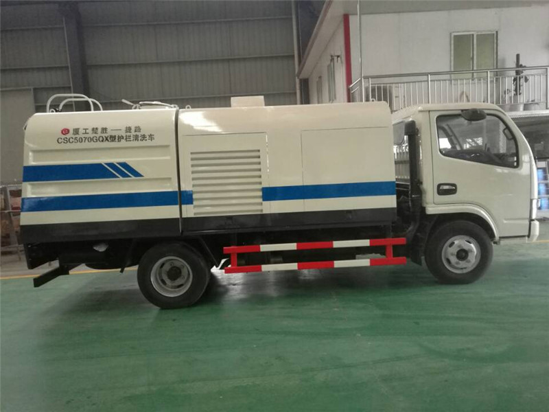 护栏清洗车具有高效清洗城市道路隔离护栏的环卫专用车辆,该产品采用了无须添加清洗液的设计方式。因为,任何一种清洗液都是粘滑的,与水混合喷出,瞬间是不会被气化的,因此,会降低刷丝与工作面的摩擦,降低清洗效果,而我们设计的清洗刷刷丝采用多棱聚乙烯超软材料设计制作,不仅不会损坏钢板表面的防腐装饰层,还可以有效地清除不同的污浊物,同时,比起添加清洗液的清洗方式更加环保。是城市环卫车物美价廉环卫工作的理想设备,是国家专用汽车规划重点发展方向之一。