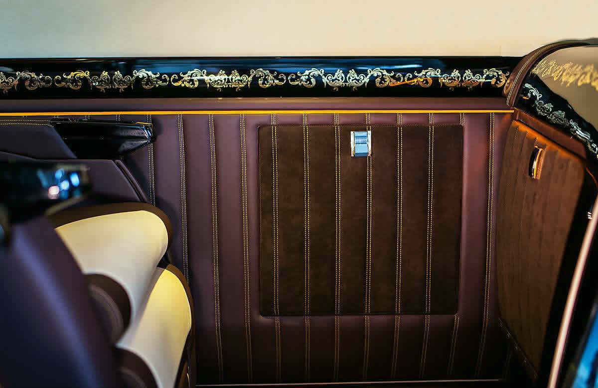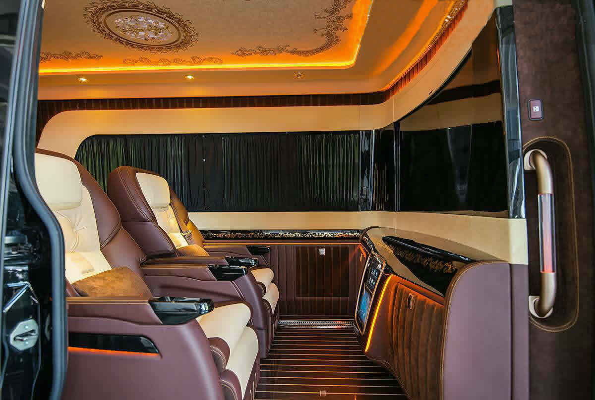 前排真皮包覆方向盘,中央扶手替换为车载大容量冷藏箱,随时为后排贵宾供应新鲜,前后排是有分隔屏隔断,墙上配备了大曲屏电视和哈曼卡顿音响。豪华的内饰舒心舒适,缓解工作上的疲劳,娱乐配套设施又给您放松之余来些娱乐。这些享受就是俊浩改装的斯宾特所带给你。稳坐车内即可让您安静地大隐于市,闲逸潇洒于繁华都市之间。