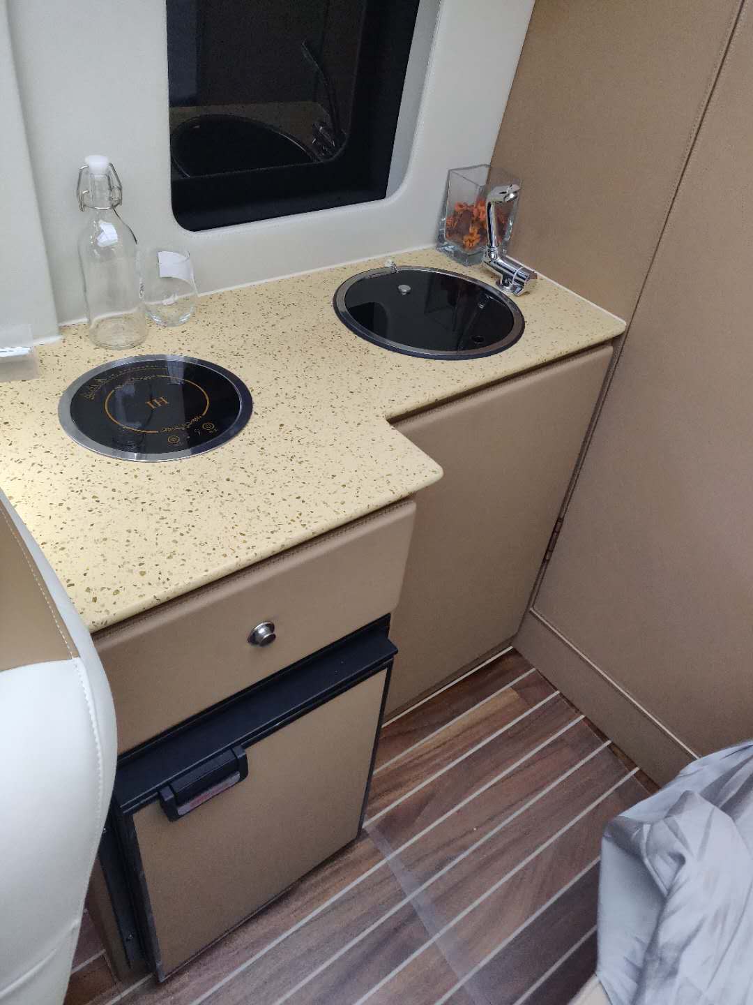 车辆的储物柜和厨房.电冰箱.微波炉(烤箱)和美的全套房车厨房系统.洗.做.切一体式.无烟低噪音抽烟机让你移动的家没有一点异味.固定的电磁炉,可以在让你清晨起来有碗养胃的粥.夏天户外的烧烤。冬天房车里的火锅.走到哪里都有美食相伴.