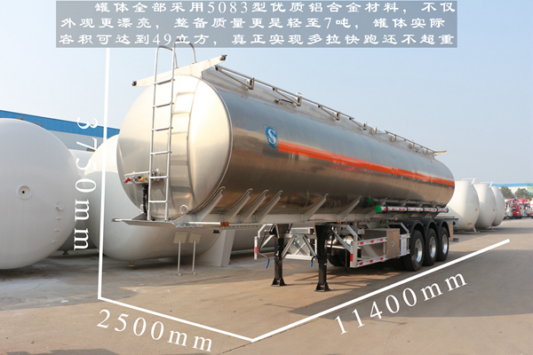严格按照国家公告外形及罐体尺寸生产,罐体容积38方、40立方、42方、43方、46方、50方, 单仓结构,采用5083型优质铝合金材质制作,筒体5.2mm,封头5.75mm厚,防浪板4mm厚,7块防浪板,一个气动海底阀,两个欧标罐口,两个进料口,罐顶围板内铺防滑钢网,罐尾左右各一个DN80自流阀带保护箱,罐体中段骨架上一个自流阀带保护箱(能与牵引头快速连接),后爬梯,两根输油管,两个大灭火器。其余厂内标配。 |