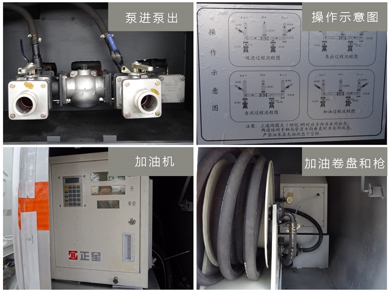 罐体采用武钢专用容积板制作,罐体厚度4.5mm,封头厚度4.5mm,根据客户要求,加油机可设计成内置和下挂两种形式,当加油机内置时,罐体容积为5.1m³,当加油机下挂时,罐体容积为5.3m³。单仓结构,可分仓,配专用油泵可泵进泵出,65mm的自流口,一个铝合金欧标罐口,一个铝合金海底阀,一个卸油阀,一套油气回收系统,一套防溢流报警系统,配上海柏莱小流量税控加油机,15米加油卷盘带枪,还可选装正星、恒山、三金、常稳等其它品牌加油机,大小流量可选。